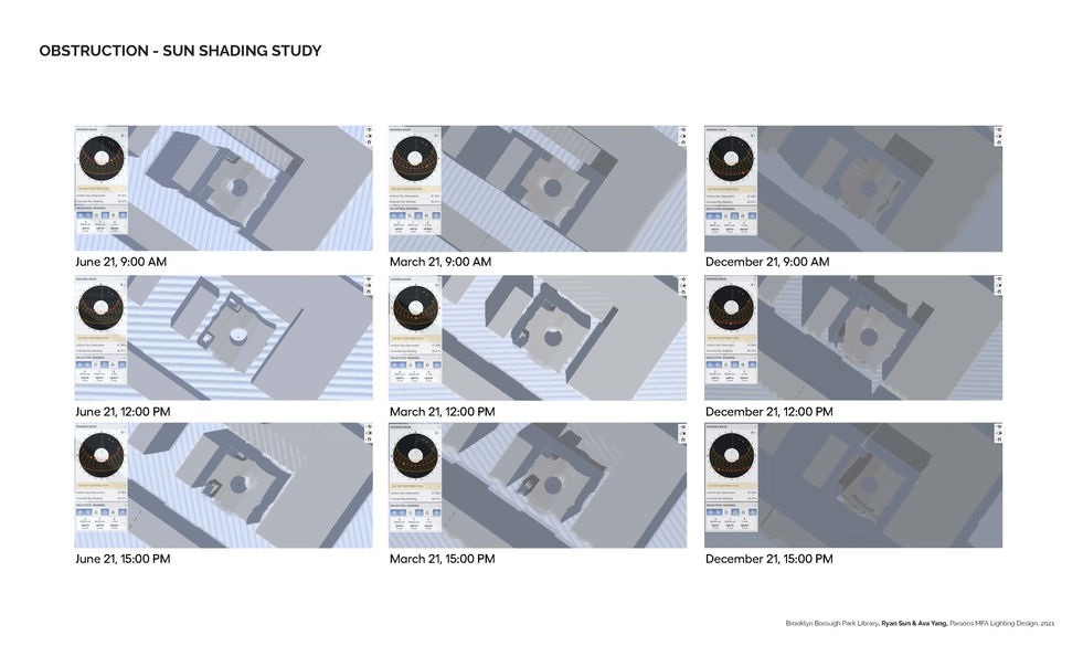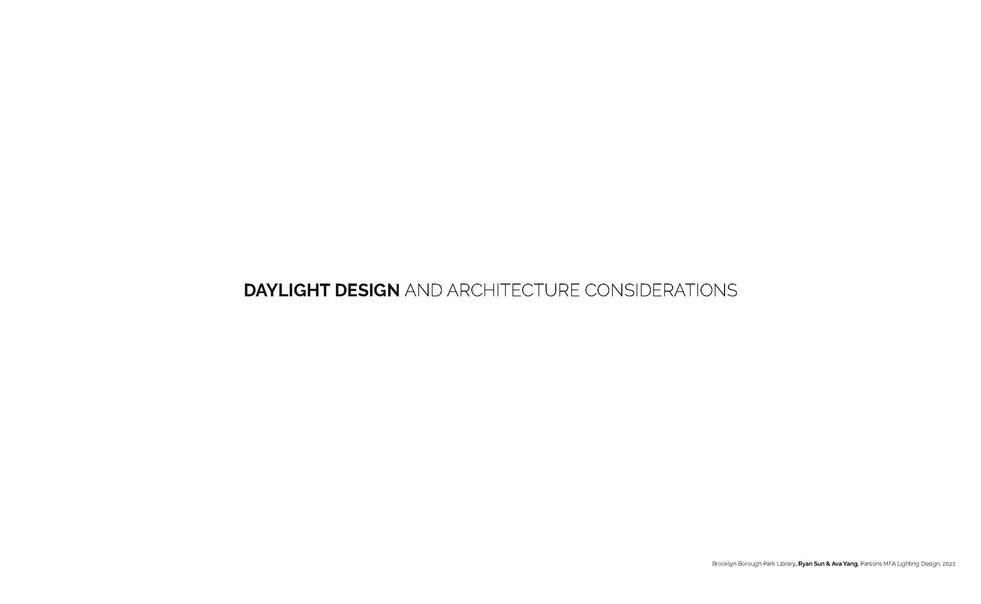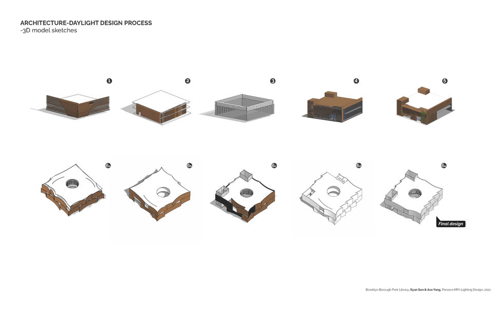 The subject of interest is a revamp initiative for the Brooklyn Borough Park Public Library, whose primary objective is to devise a facade strategy that optimally distributes natural illumination throughout the library's interior. The ultimate aim of the library is to foster a sense of interconnectivity amongst both the youth and the adult population to encourage social congregation within the Brooklyn community. The building comprises a sizable, circular communal area, as well as distinct public and private reading zones, with each area possessing unique lighting qualities obtained from an assortment of contrasts between light and shadows. The proposed facade will consist of red bricks arranged in diverse densities to create diverse daytime visual effects. The central oculus communal space will serve as the brightest focal point, thereby accentuating the notion of a central gathering hub for the community. In essence, this is a library that embodies an atmosphere of erudition, literature, and recreation.